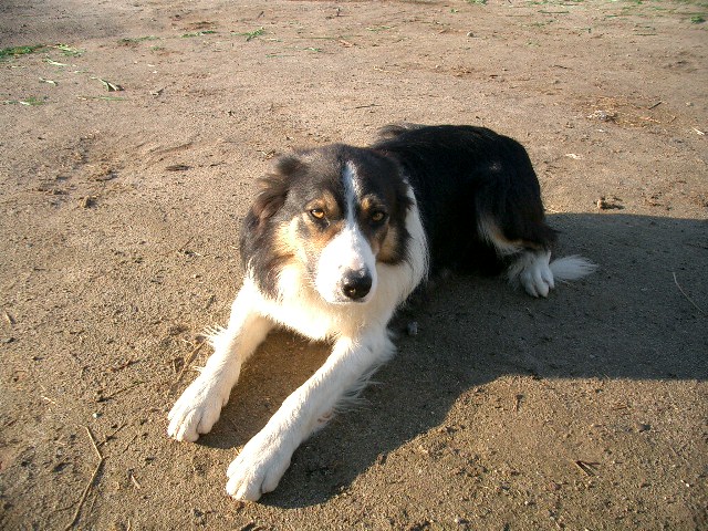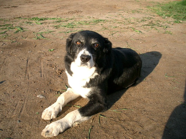 牧場の初代牧羊犬はアッシュ(♂)です。今から5年前に鶴居村のYさんに譲ってもらいました。来た時の年齢は5歳でかなりいいオッサンです。Yさんの所では羊を追わず食べてばかりで邪魔だと言うのでもらってきました。丁度その当時僕の所ではキツネの被害が出てて良い番犬が欲しかったのです(アッシュはボーダーコリーとは思えないほど図体がでかい)。僕の所に来ても最初のうち全く羊を追うことに興味を示さず、どちらかと言えば怖がってるぐらいで本当にただの番犬でしたが、ある時僕が羊相手に仕事をしている時、柵の外側で目をぎらつかせウロウロしているので、コレは一緒にちょと追ってみるかと思い、中に入れて一緒に走ると何となく羊追い始めました。この日から毎日僕はアッシュと一緒に牧草地走り回り、右回り、左回り、前進を教えました。結局僕の側を離れて羊を追うことはしなかったけど(やっぱり羊は怖い)、アッシュが居るのと居ないのでは大きく違い、なんちゃって牧羊犬として大いに役立ちました。アッシュの存在が僕に次の牧羊犬(ちゃんとした)を飼う事を決意させ、それと共に牧場の拡大を決意させました。今では全く羊を追わず(オリバーが来て羊を追い始めたとたん自分の役目は終わったとばかりにやめた)ご隠居生活です。性格は非常におとなしく、優しく、3頭のうち唯一子供たちに愛され(残り2頭は小うるさいので嫌われ者)、よく食べ、よく寝て、多く出す(食べた以上に)犬です。多くの逸話、笑いのネタを持っています(それは追々)。